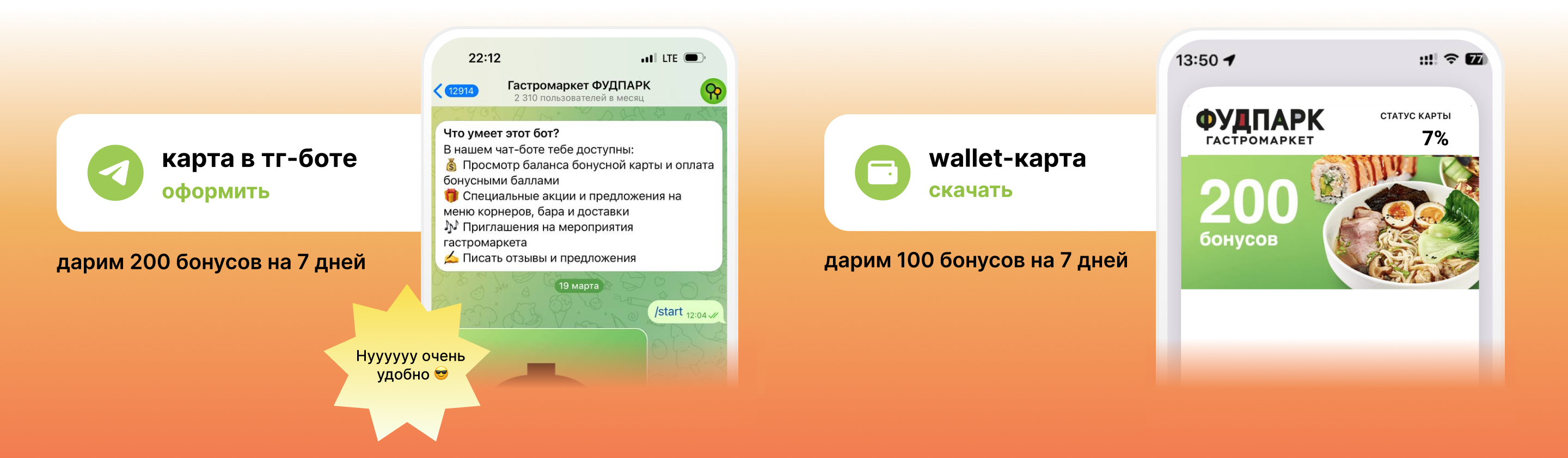 За оформление wallet-карты дарим 100 бонусов на 7 дней. За оформление карты в ТГ-боте дарим 200 бонусов на 7 дней. Бонусная карта становится активной с момента заполнения анкеты.